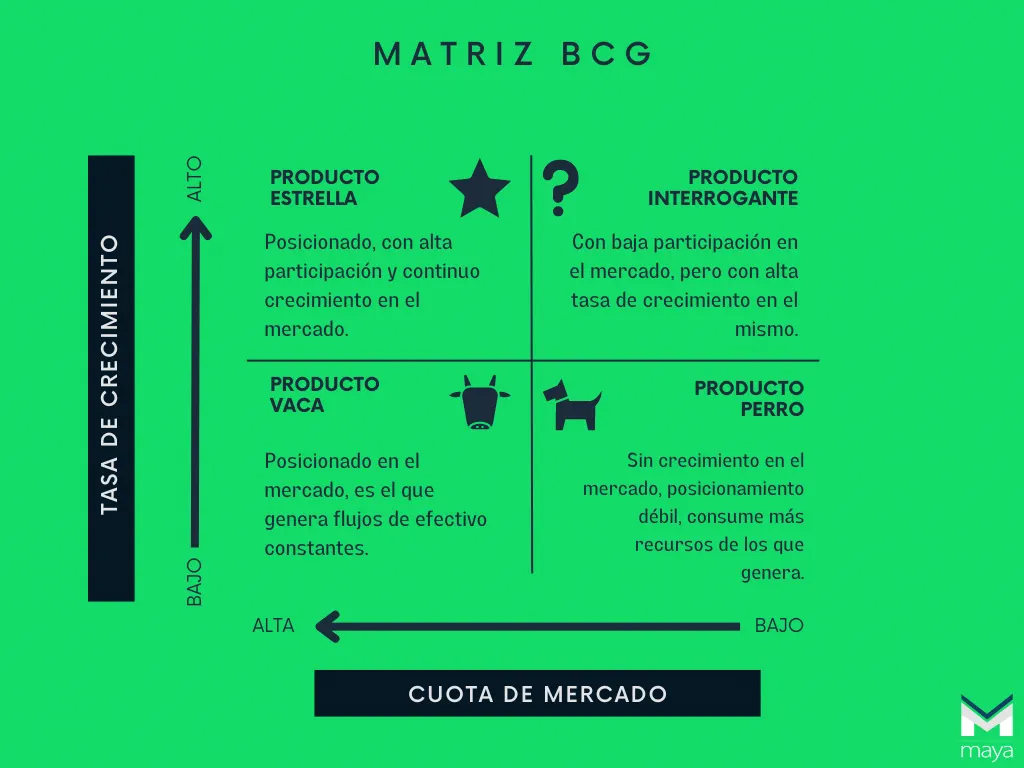 La Matriz BCG es un modelo que clasifica las unidades de negocio o productos de una empresa en cuatro categorías: Productos estrellas, productos vacas, productos interrogación y productos perro, según su tasa de crecimiento y participación en el mercado. Esta matriz facilita la toma de decisiones sobre en qué productos invertir más recursos, cuáles requieren mejoras o cuál es más rentable para sostener el flujo de caja.